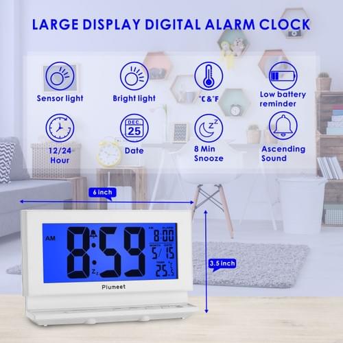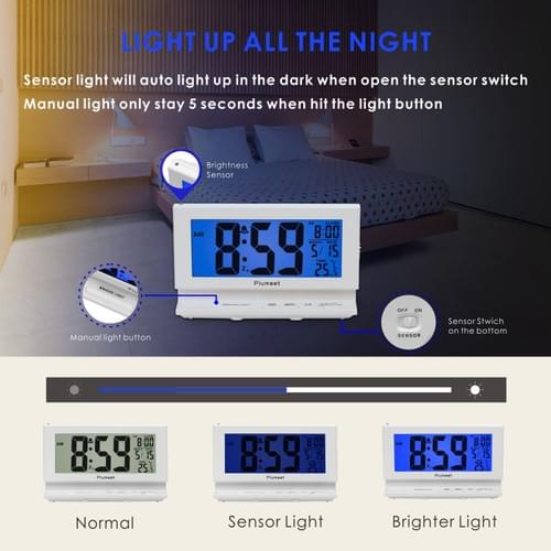 Smart Night Light -- Turn on the sensor, sensor light enables clock to automatically give off soft white light(25% brighter) in dark to lift a comfortable night view. the soft nightlight is bright enough to see but not light up the room to disturb your partner.